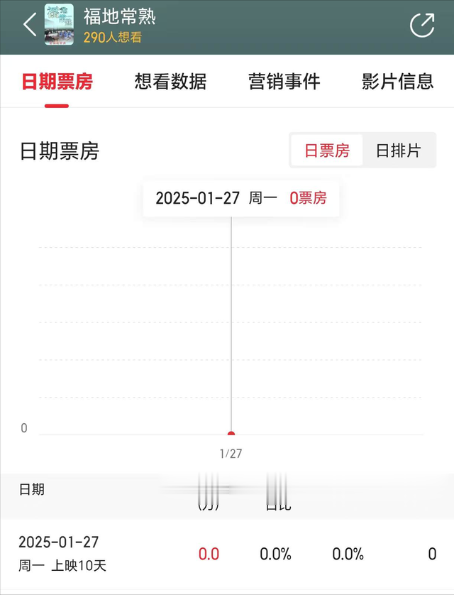 而电影票房为0,我觉得也不怪电影的工作人员不支持,因为他们可能想支持也不知道怎么支持。这部《福地常熟》,说是2025年1月18号上映,但从猫眼网的票房分析上看,根本没有影院排片,这个发行公司宣传上映,就是个口头上映,你想看都看不到,主打一个不坑人。