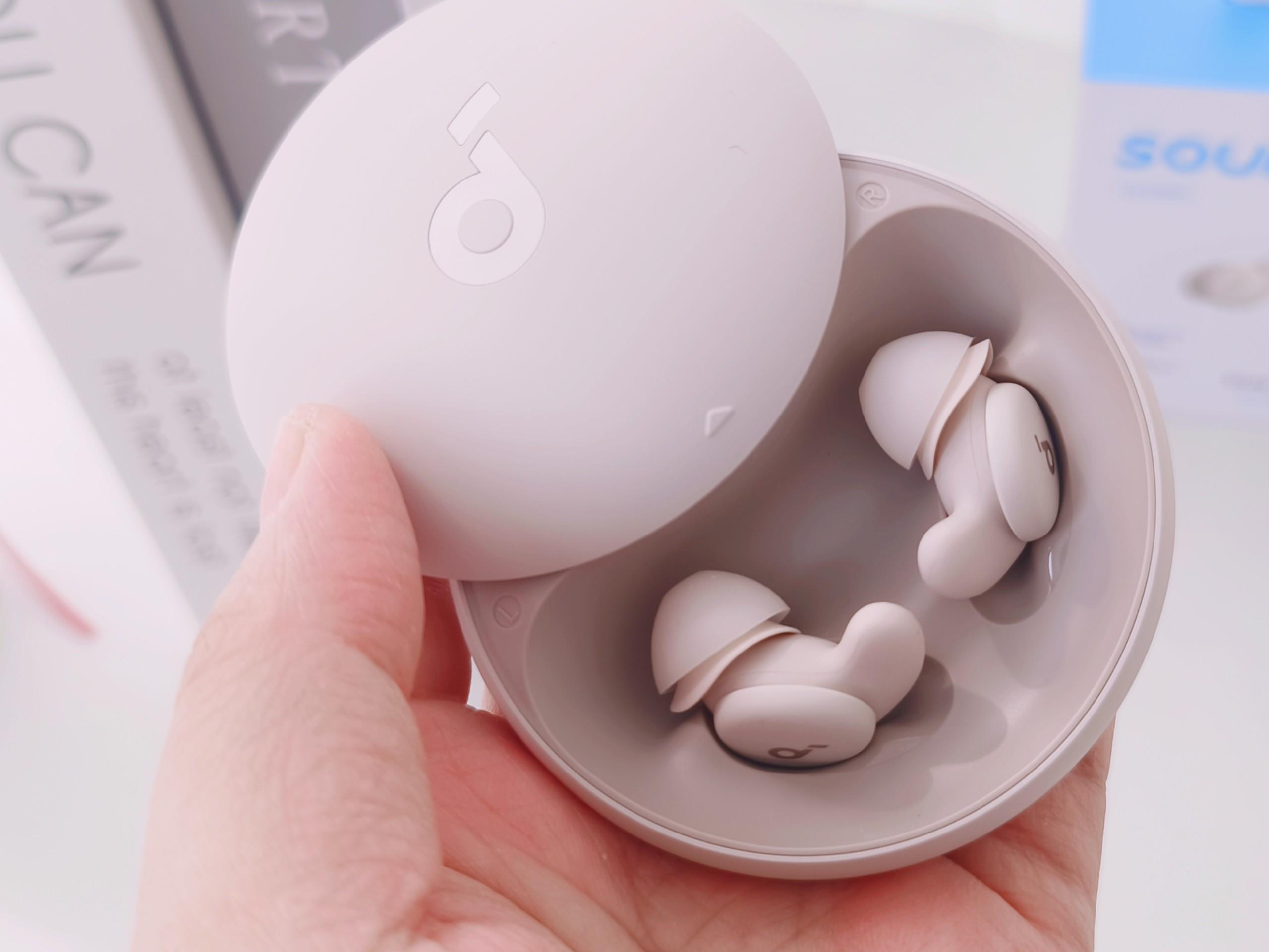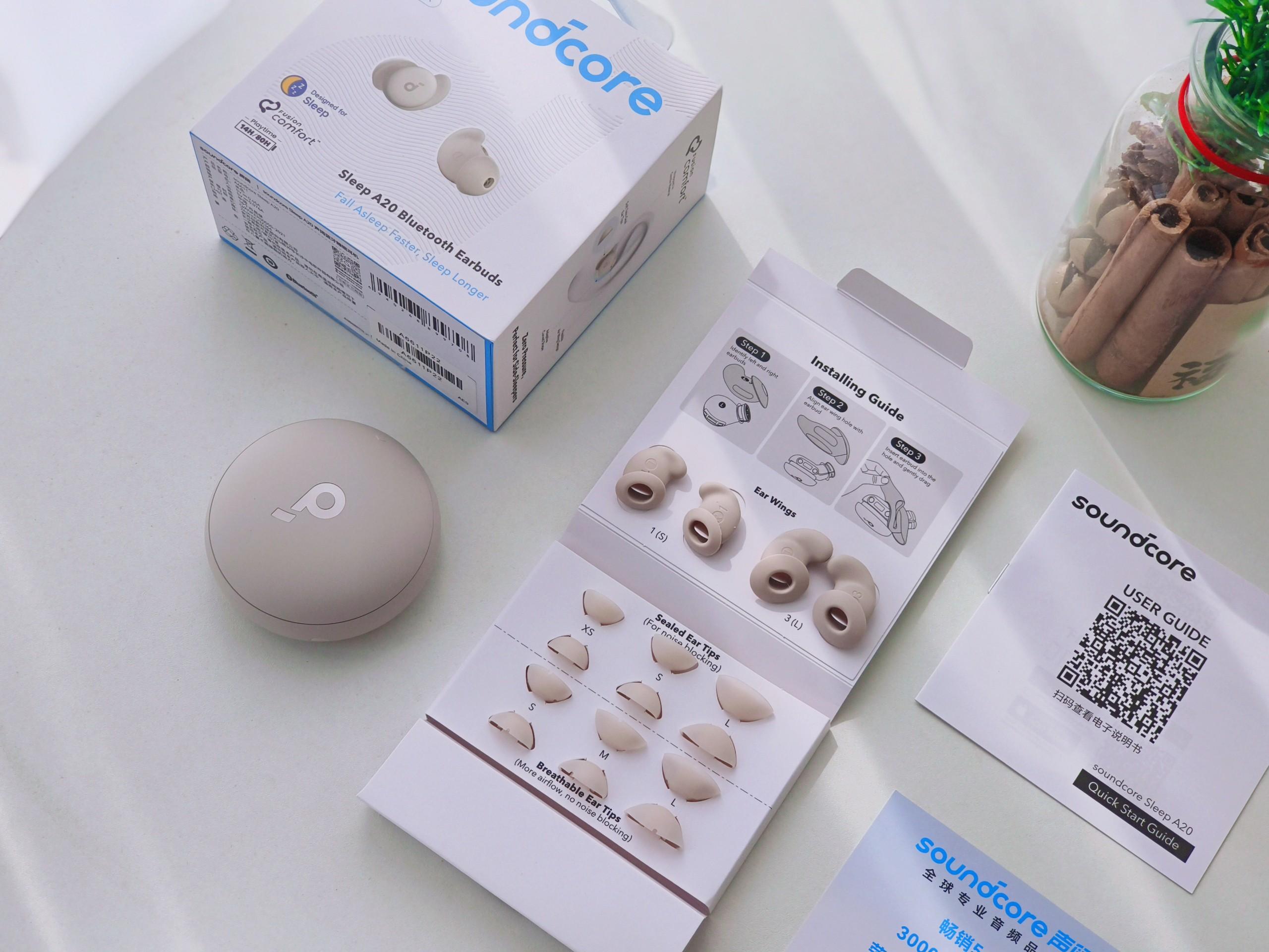 外包装上就不多加赘述了,相比其他产品来说,声阔睡眠耳机A20外包装比较精致,配件上也是简约又不失格调,除了常规的说明书、保修卡和充电线外,还包括了3副耳翼、4副封闭式隔音耳帽、3副透气开放式耳帽以及充电盒。这款耳机专门为睡眠场景打造,米色配色简约时尚,男女佩戴都合适。