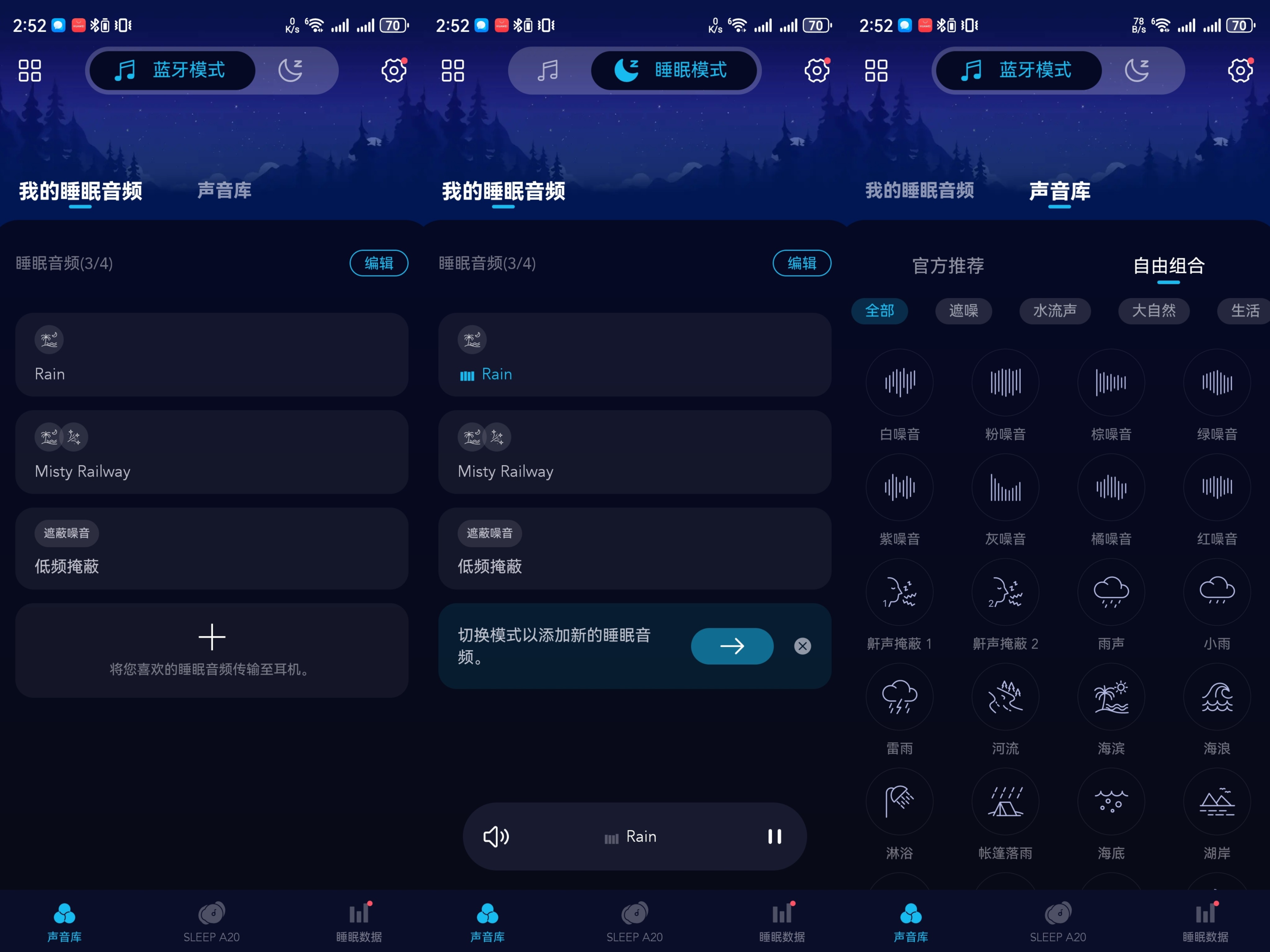 睡眠模式是这款耳机的主打部分,切换到睡眠模式后,可以播放预置的睡眠音频,也可以导入到耳机中,这样就可以脱离手机使用,即使在户外手机没电了也能尽情享用。或者自定义睡眠音频,通过内置的100+种白噪音/大自然音效,我们可随意组合,DIY出最适合自己的睡眠曲库,可以试试把雨声和风声结合在一起,在耳仓中模拟下雨的声音,真的很适合助眠。