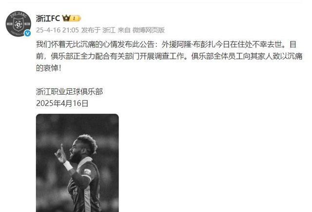 昨晚,浙江队官方账号发布公告,向布彭扎的家人致哀,对去世原因一字未提,但表示会全力配合调查。