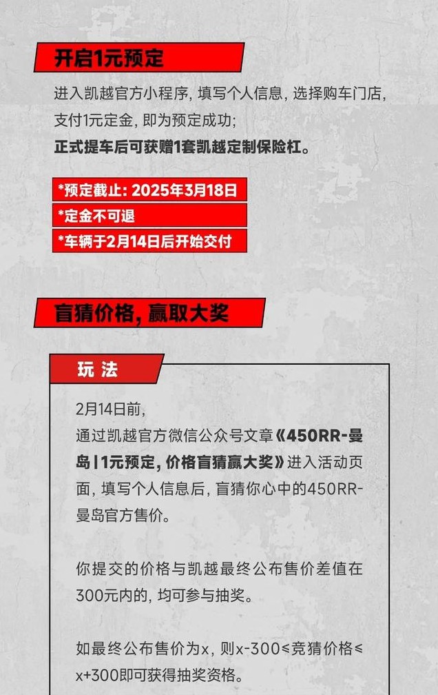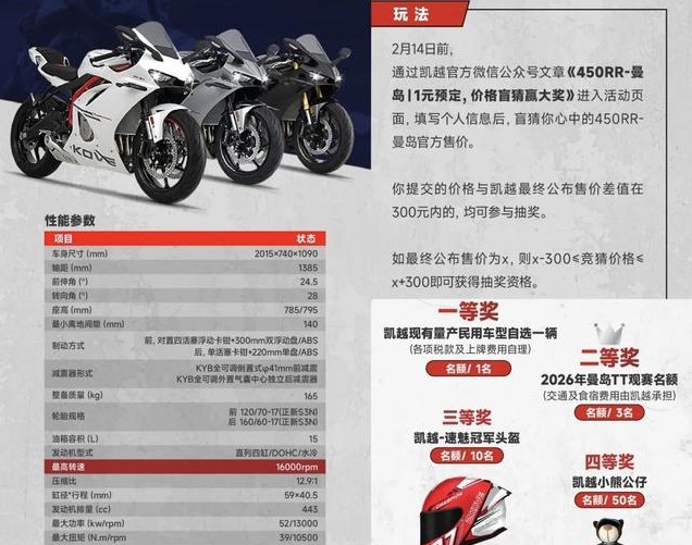 凯越在今天正式公布2025款450RR 曼岛版的到来,并且还推出了“价格盲猜”的活动。其中参与“1元预定”的用户可以在正式购车后免费获得1套定制保险杠,该活动截止日期为3月18日;“价格盲猜”只要猜测差价与公布售价在上下300元内就可获得抽奖资格,并且还设有丰富的奖品,一等奖可任选凯越民用车型,二等奖则是食宿全包曼岛TT观赛名额等,该活动截止日期为2月14日。