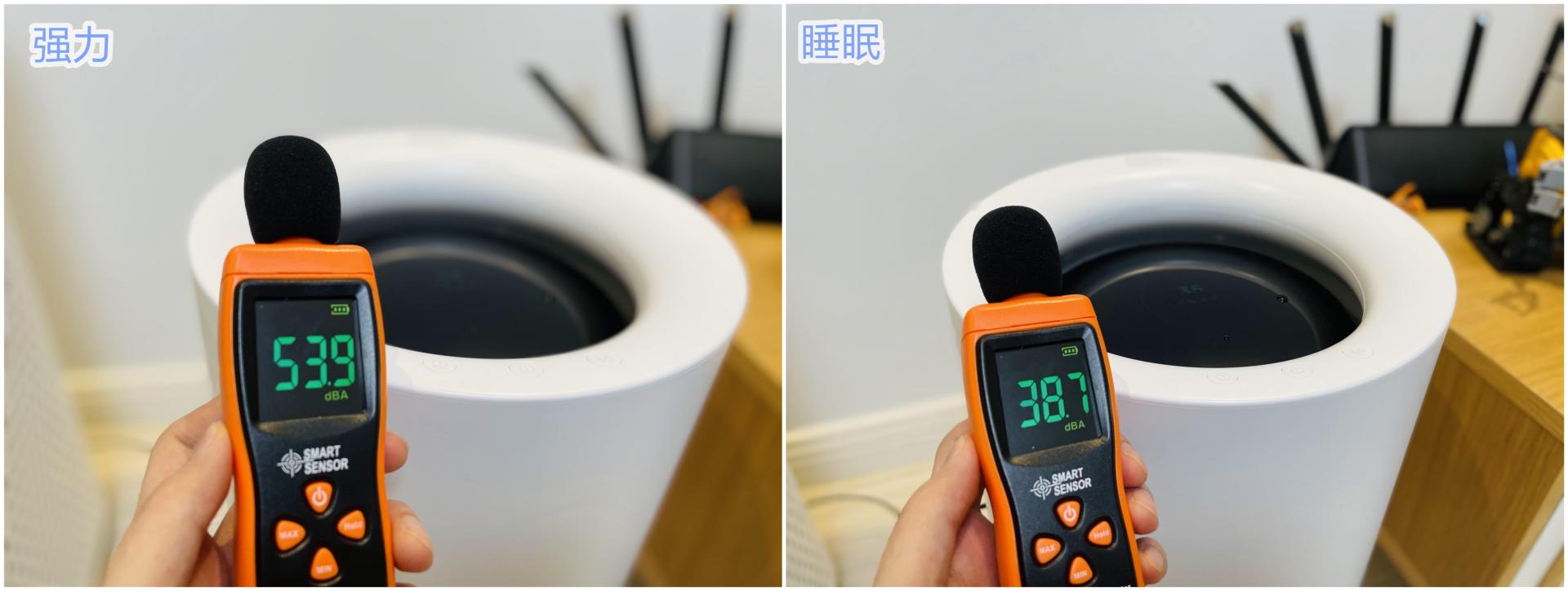 加湿器使用过程中的噪音是我们十分关注的,实测强力档位工作噪音53.9dBA,这个档位可以听到明显的风声,但如果是在看电视或者刷抖音,这个音量基本可以忽略;睡眠档位工作噪音38.7dBA,可以说几乎听不到任何的声音,夜晚睡觉使用非常的舒适