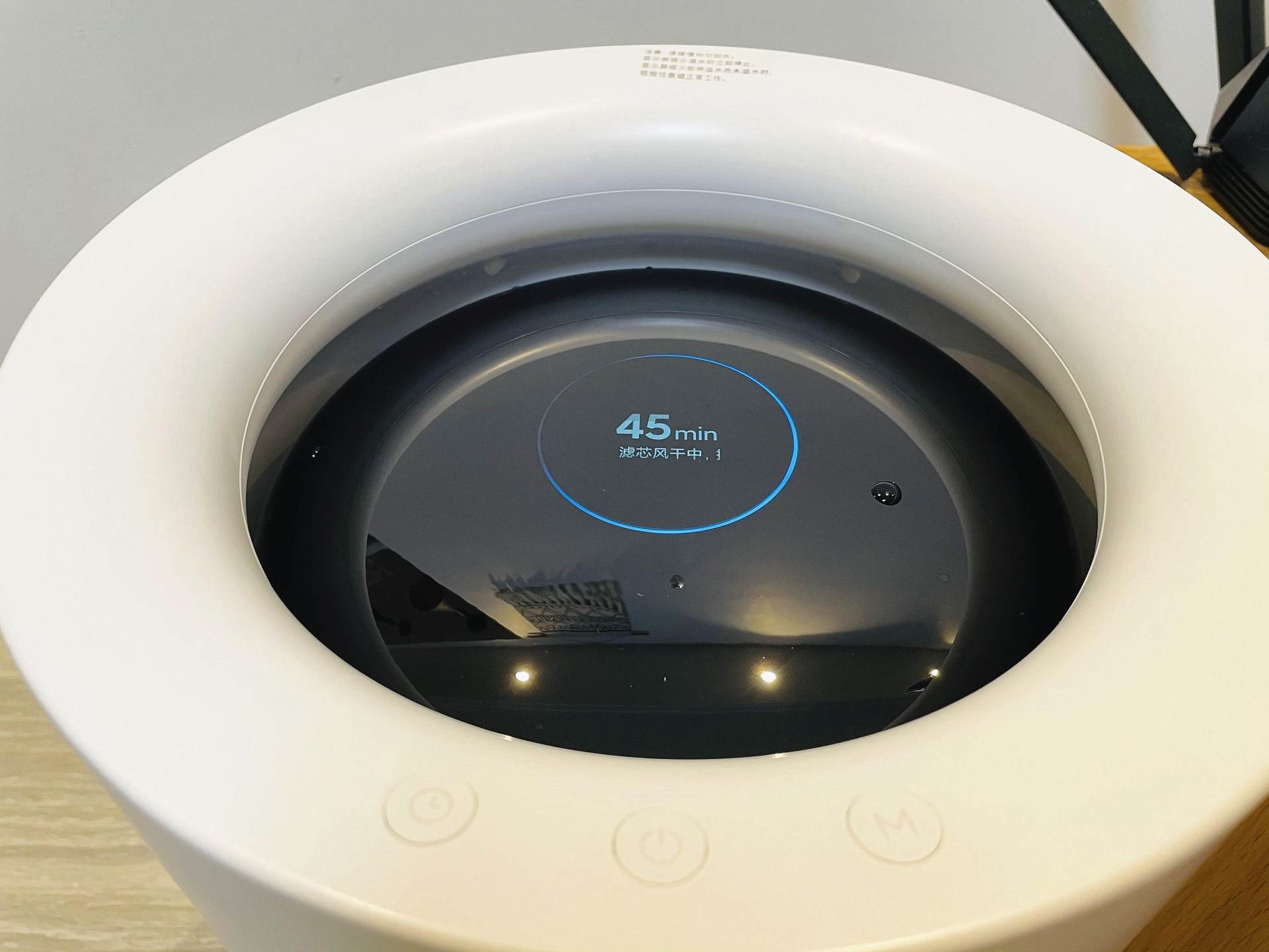 ▼加湿器顶部的黑色区域是OLED显示屏,接通电源时主机的状态就会实时显示在屏幕上,机身边缘处分布3枚实体按键,按键按压的手感不错