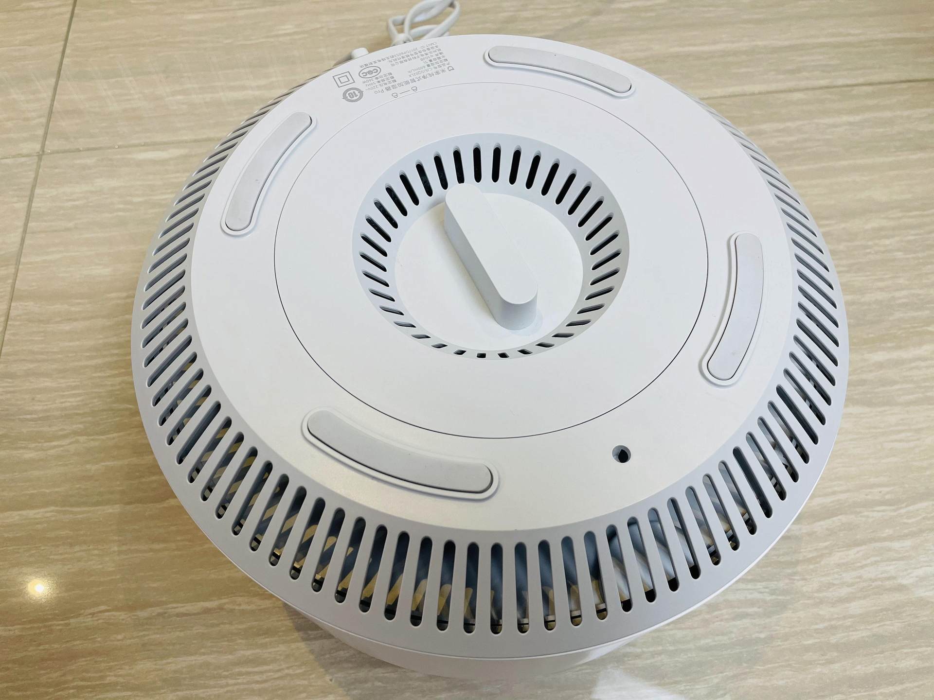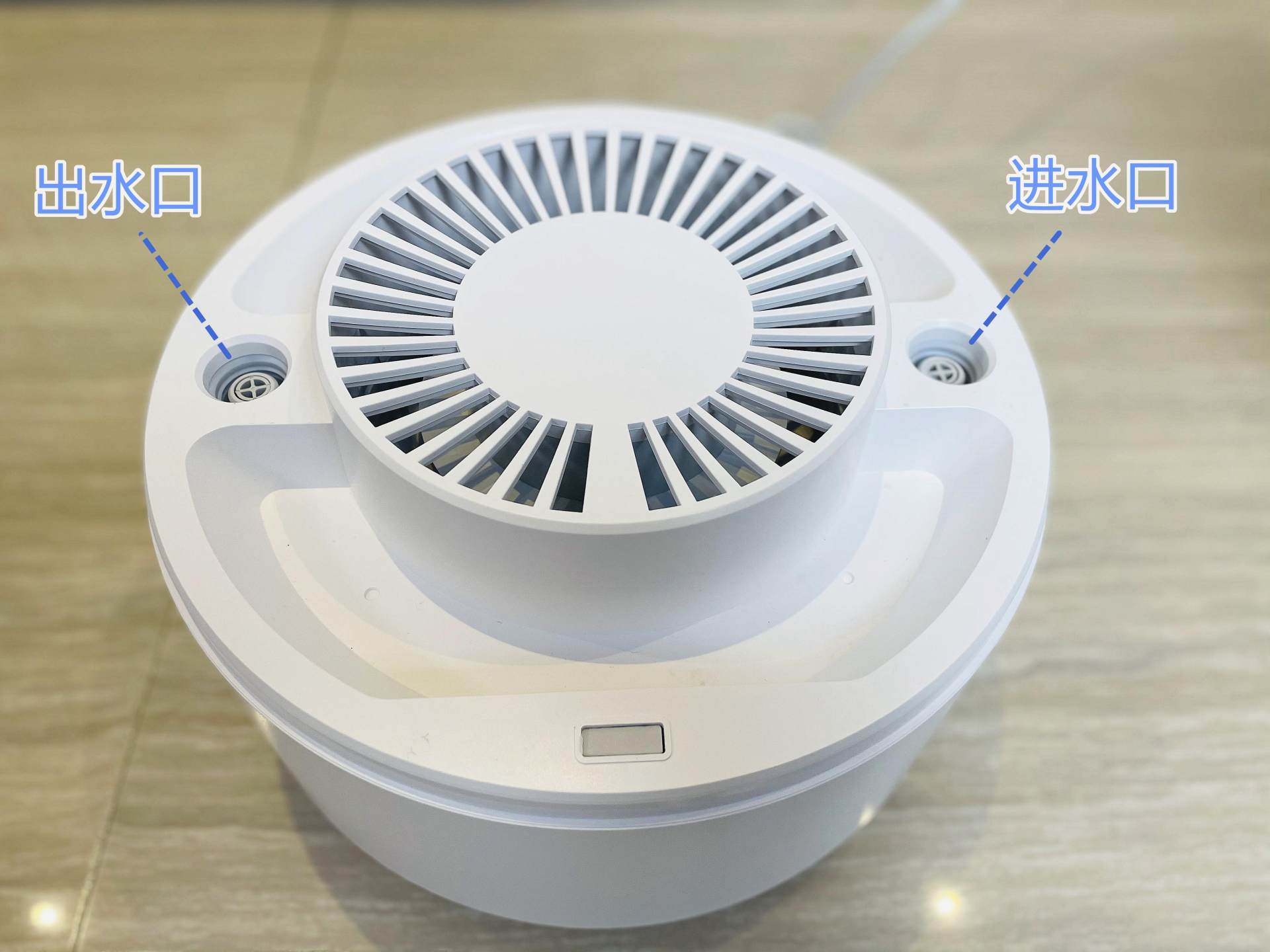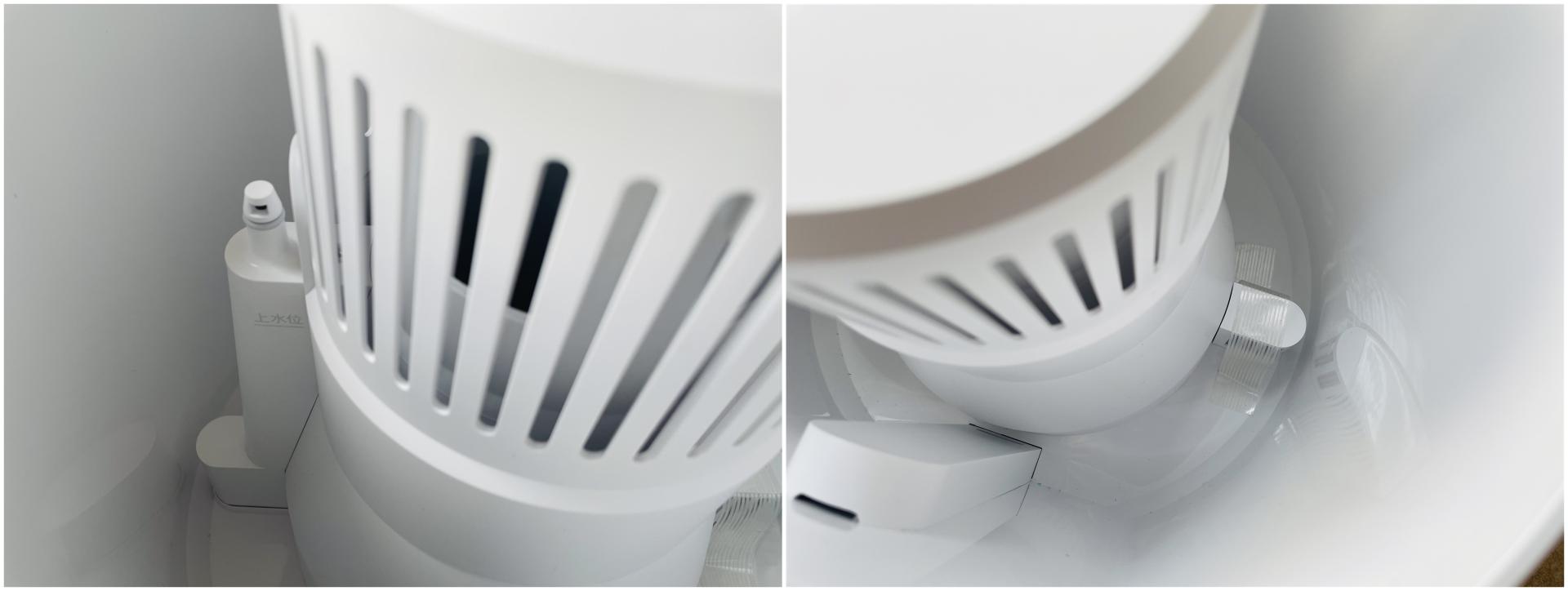 ▼加湿器底座机身左右分布着出水口和进水口,经过过滤网的纯净水通过底座的风扇吹出风自然蒸发,最终从顶部排出