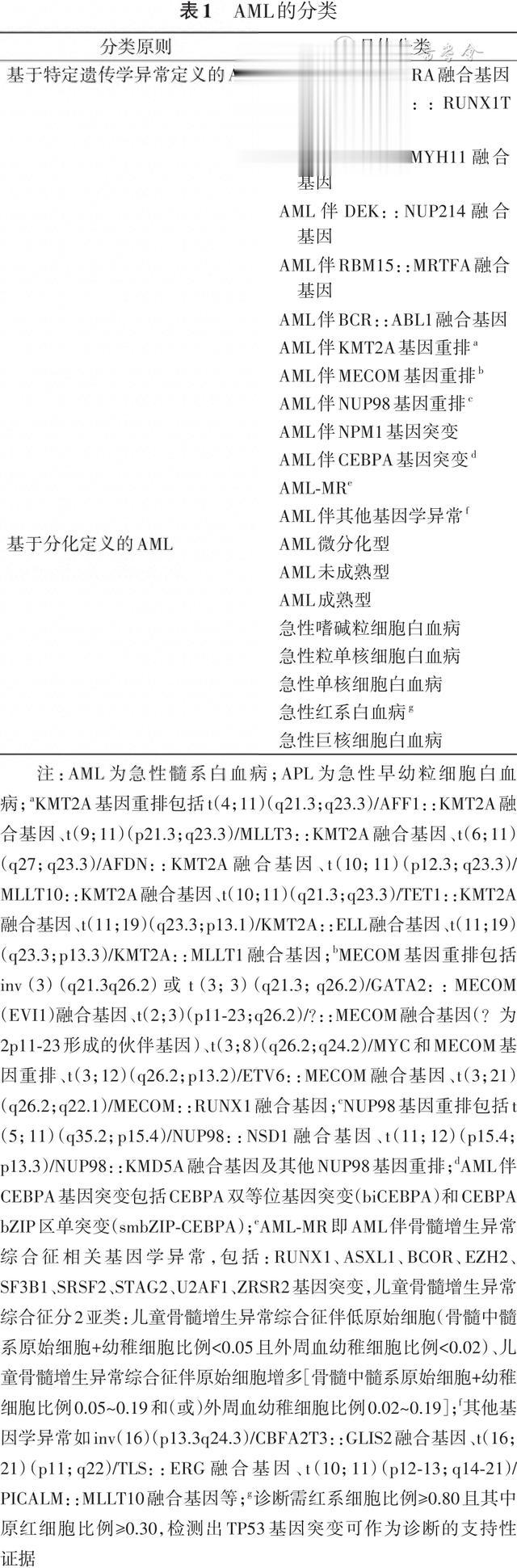 本共识综合了2022 WHO分类标准及2022 ELN建议,采用“特定性遗传学异常”替代既往“重现性遗传学异常”的表述。包括基于特定性遗传学异常的AML和基于分化定义的AML两种分类(表1)。