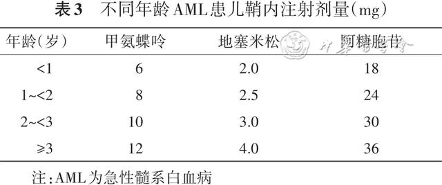 儿童AML应在全身化疗的同时进行鞘内注射预防或治疗中枢神经系统白血病,见表3。