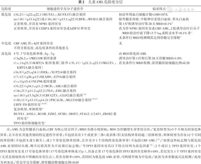 近年来随着各种组学及测序技术的广泛应用,对儿童AML危险度分层的认识也在逐年丰富及更新。本共识综合患儿初诊时细胞遗传学、分子遗传学改变以及对治疗的反应进行危险度分层,低危组需满足细胞遗传学、分子遗传学其中之一,伴NPM1基因突变或核心结合因子(core binding factor,CBF)AML需满足多参数流式细胞术(multiparametric flow cytometry,MFC)MRD、分子MRD其中之一即可,具体危险度分层见表2。