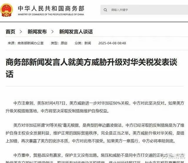 4月8号那天,中国商务部明确放话了,要是美国再提高关税,中国肯定会毫不犹豫地采取措施反击,保护自己的利益不受损。