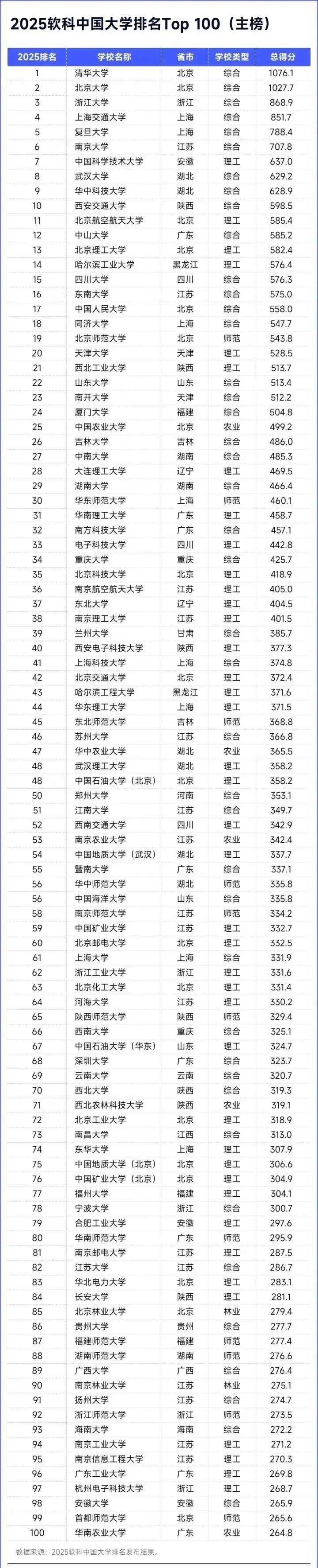 在主榜(即综合性大学排名)中,清华大学、北京大学、浙江大学稳居全国前三,并已连续11年蝉联中国大学三甲,展现出强劲的学术与科研实力。紧随其后的是上海交通大学和复旦大学,分别位列第四和第五。