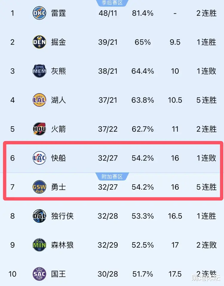 4天时间里3场球,湖人连赢的独行侠,森林狼和快船,分别是之前排在勇士前面的三支球队。勇士从西部第12一路冲到了第9,当时第8是独行侠,第7是森林狼。然后詹皇先打独行侠,再灭森林狼,把勇士抬到了第七,现在又把第六的快船打下来了。