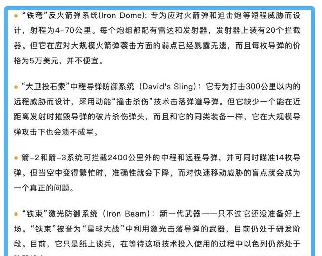 “大卫投石索”主要被用来拦截40公里-300公里导弹,而箭-2和箭-3系统主要被用来防御射程在2400公里内、高度100公里内的弹道导弹。至于“铁束”激光防空系统其实还有可能没有投入使用。