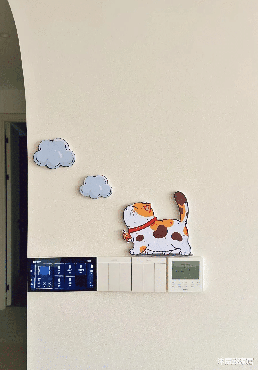 看久了大白墙觉得单调的话,不妨在开关面板上装一个猫咪墙贴板,让家一下子变得温馨起来。这个猫猫墙贴板背贴的是泡沫胶,黏性很强,可以直接贴在乳胶漆的墙面上。
