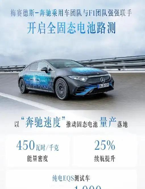 奔驰以前就跟欧洲几家电池公司一起搞固态电池的研发,现在这事又有新进展了。最近,奔驰官方发了张海报,说他们跟F1团队合作,开始在路上测试全固态电池了。这电池装在了EQS车上,能量密度达到了450Wh/kg,续航能多跑25%,充一次电能轻松跑1000公里。