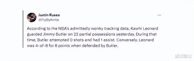 特别是在防守端,根据赛后的数据统计,伦纳德在22个对位回合里完全限制住了勇士强援吉米-巴特勒,在伦纳德主防巴特勒的22个回合里,巴特勒甚至连一次投篮机会都没有得到,仅仅只有1次助攻,进攻上完全被锁死。