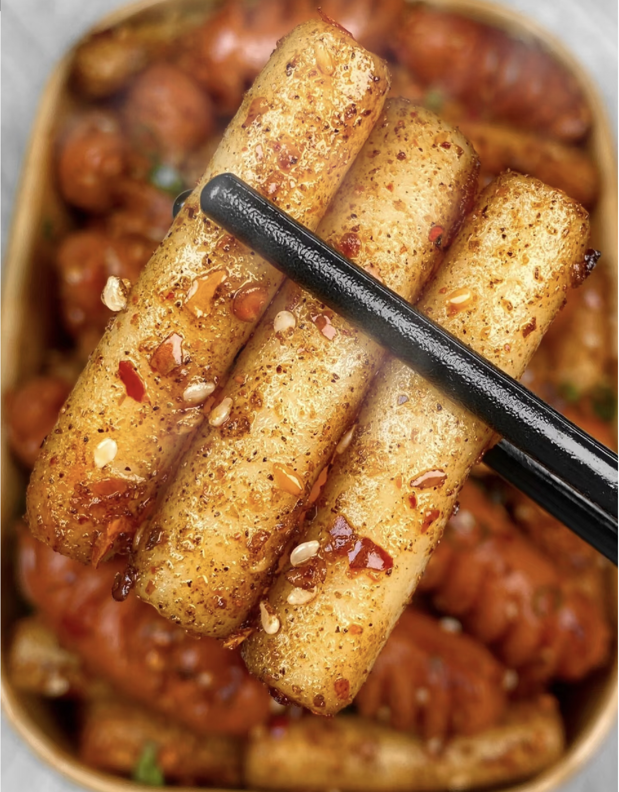 接着,我们将年糕加入锅中,与香肠一起翻炒。年糕在炒制过程中会吸收香肠的香味,变得更加美味。在翻炒的过程中,我们可以根据个人口味加入适量的生抽,这样可以增加菜肴的鲜味。同时,加入辣椒面和孜然粉,这两样调料不仅能够提升菜肴的香气,还能让口感更加丰富。