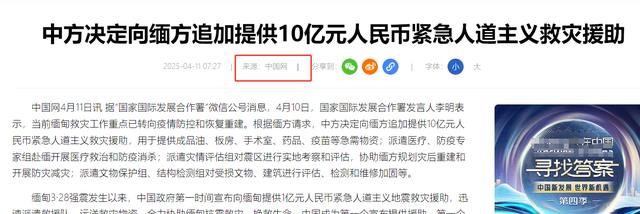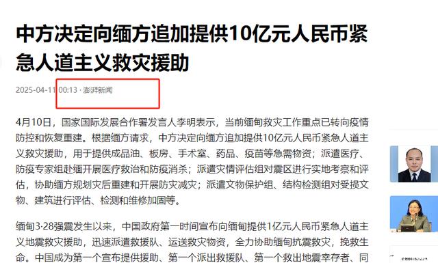 4月10日,中方应缅甸请求,宣布追加10亿元人民币紧急人道主义救灾援助。