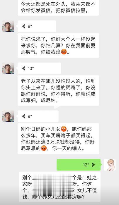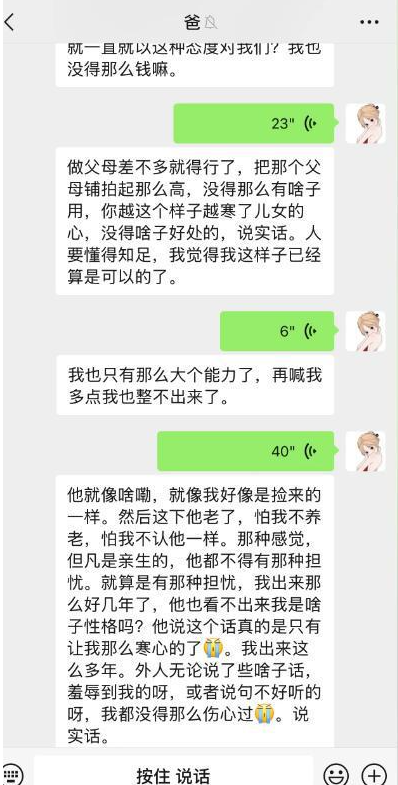 于是开始隔着手机破口大骂“真是白养你了,跟仇人一样、可惜了我一个鸡”之类的话不断输出。
