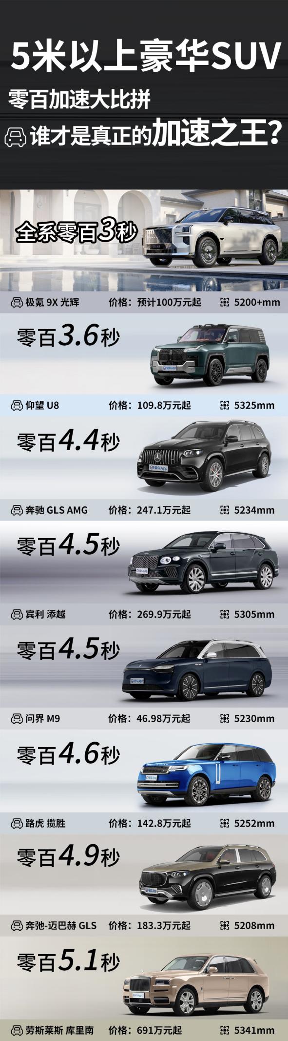 5米以上豪华SUV,谁是真正的加速之王?这波我站国产新能源车!话不多说直接上榜单,极氪9X光辉全系零百3秒,仰望U8零百3.6秒,包揽前两名。这排面,宾利、劳斯劳斯都没有的好吗?