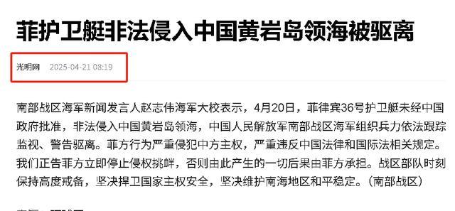 马科斯为挽回颓势,孤注一掷在南海挑衅中国。4月20日,菲军舰闯入黄岩岛领海,中方果断驱离并随即宣布在南海实弹演习,展示坚决维权决心。
