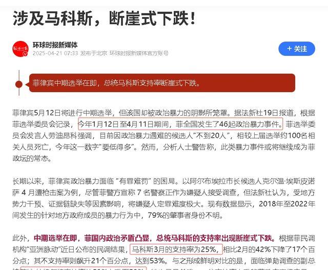 马科斯政府处处针对杜特尔特家族的做法,让民众对他的好感度跌入冰点。从1月到4月短短三个月内,菲律宾国内发生了46起政治暴力事件,约20名候选人丧生。这种混乱局面下,选民们纷纷将矛头指向了马科斯,他的不支持率一路飙升至53%。