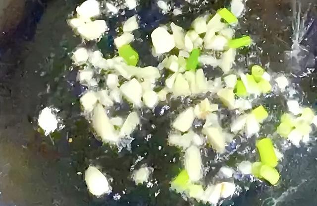 4. 锅中留少许底油,放入蒜末、姜末爆香,加入青椒块翻炒几下。