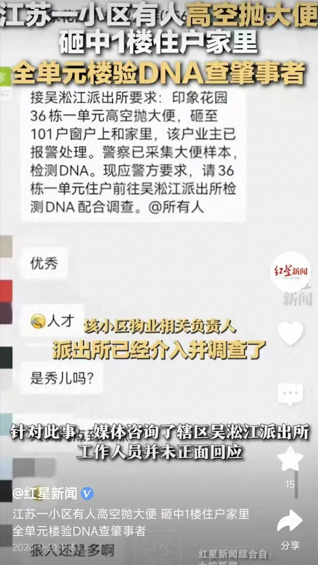 近日,在江苏省昆山市印象花园小区有人发现有人高空抛物,仔细观察才发现:原来是高空抛粪。最终,砸到101户窗户上!