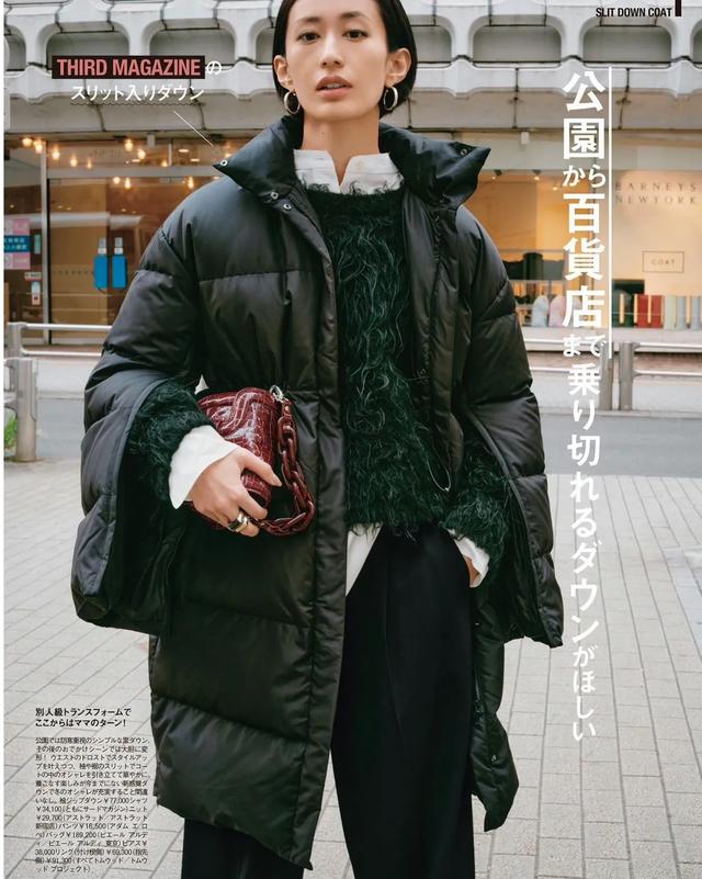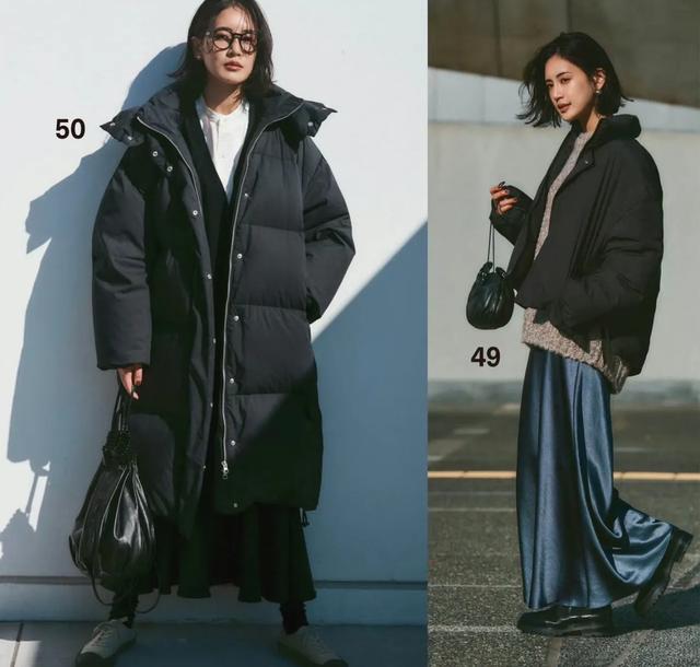羽绒服虽然看起来有点膨胀感,但是下半身搭配轻盈的裙子,照样可以打造出利落感!所以,喜欢穿羽绒服的女性来说,搭配缎面丝质半身长裙,脚踩乐福鞋或者运动鞋,尽显灵动感。