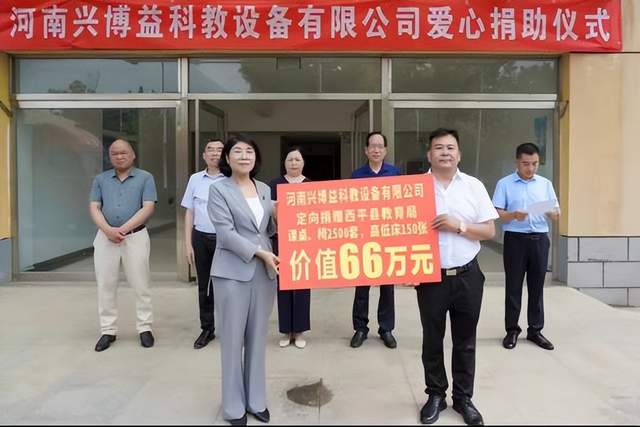 6月25日,西平县人大代表,河南兴博益科教设备有限公司负责人赵荣红向西平县教育局捐赠价值66万元课桌椅2500套、高低床150张。