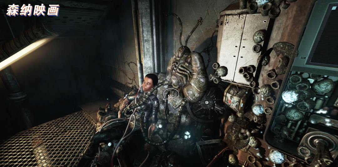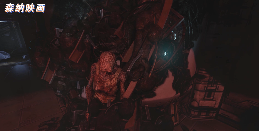 和我们之前阳光明媚的世界相比,我们进入的黑暗场景采用一种生化科技的感觉,走在废弃的工厂,有点像是身处《异形》电影之中,地上的铁锈与血迹格外瘆人,在这钢铁丛林之中丝毫感受不到一点安全感。场景的各个角落躺着一些面目全非的人类,被一团不知为何物的黑色有机物包裹着,最可怕的是,这些人还都活着,靠近还可以听到他们微弱的喘息声,难以想象他们经历了何等的痛苦。
