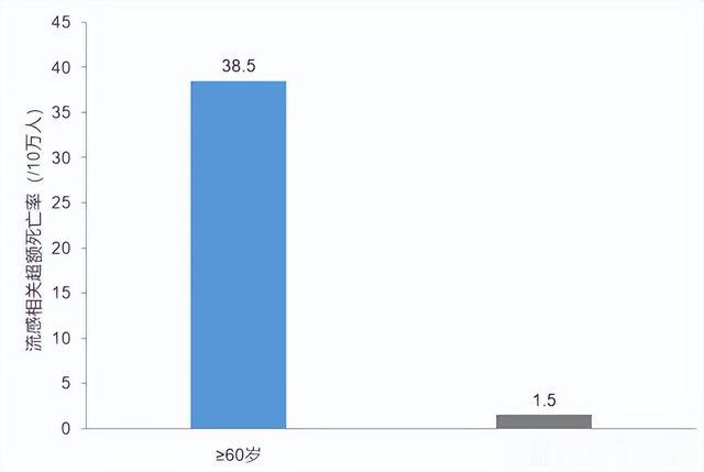 而且老年人流感后的死亡风险也远高于其他年龄段。我国研究发现,在2010-2015年间,60岁及以上老年人的流感相关超额死亡数占到了全人群的80%。其超额死亡率更是高达38.5/10万人。