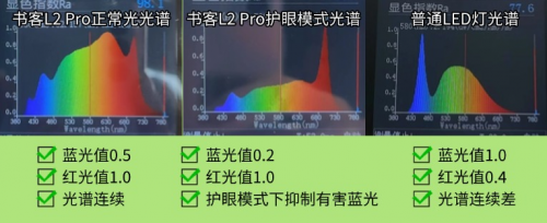 书客护眼台灯L2Pro与普通室内LED灯的光谱对比