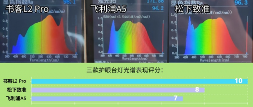 三款护眼台灯光谱表现:书客护眼台灯L2 Pro>松下致准>飞利浦A5