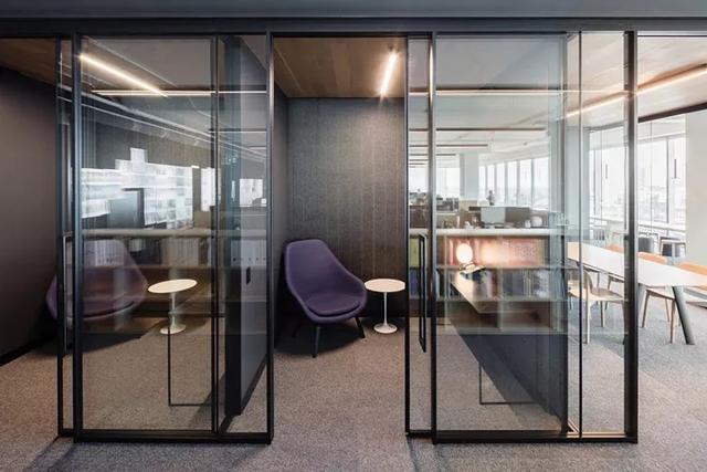 局部墙面采用由回收塑料制成的聚酯纤维吸音板,深灰的色调与浅色的橡木碰撞不仅带来高雅的质感,也传递出公司致力于可持续设计的这一社会责任感。