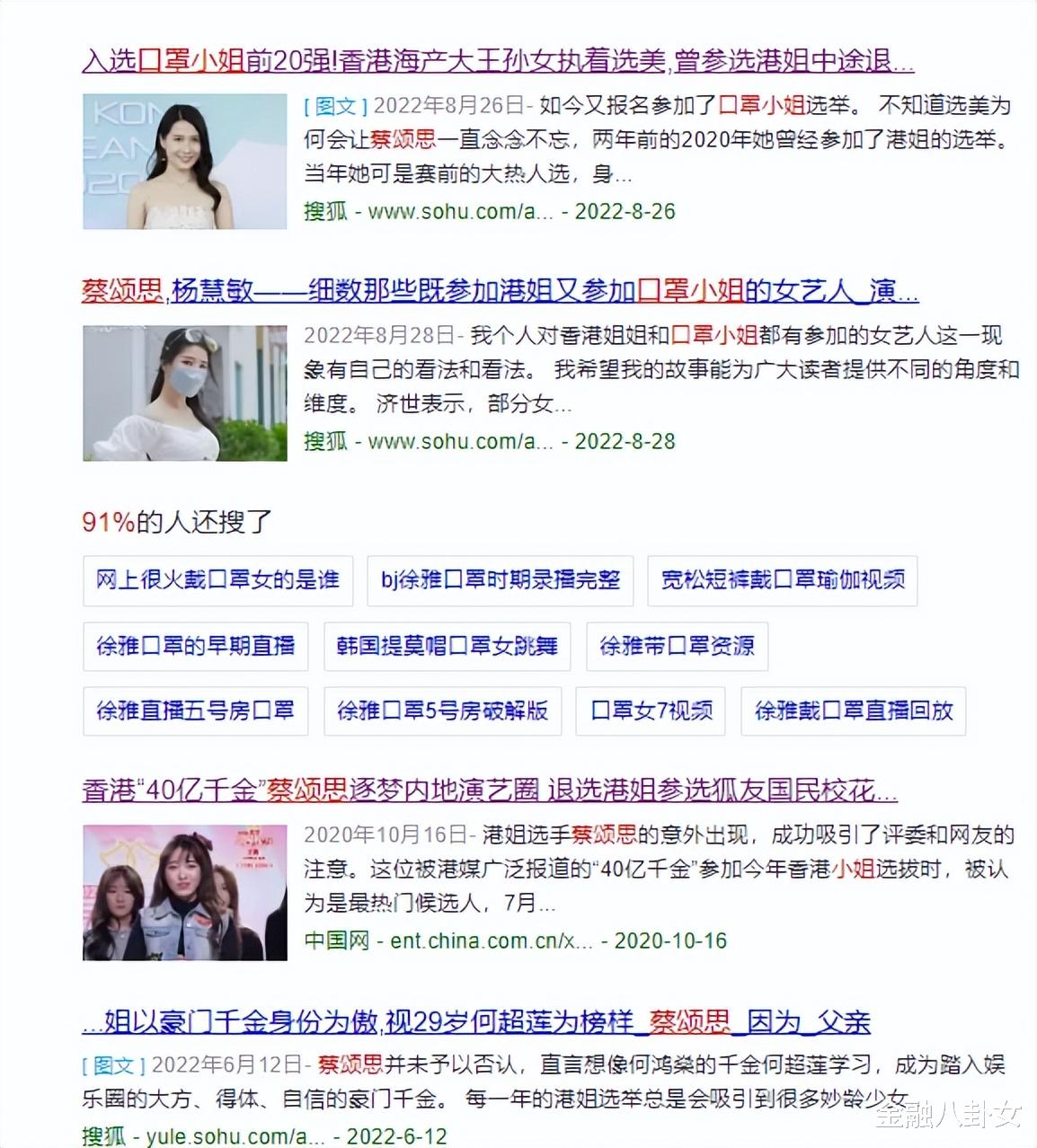 还有富三代出身的40亿千金,香港十大隐形富豪蔡冠深之女,继2020年参选港姐选举失利之后,今年又参加了口罩小姐选举……