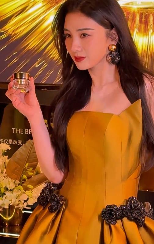一袭黄色礼服亮相品牌活动,长发随意披肩,夸张的耳饰与礼服遥相辉映。
