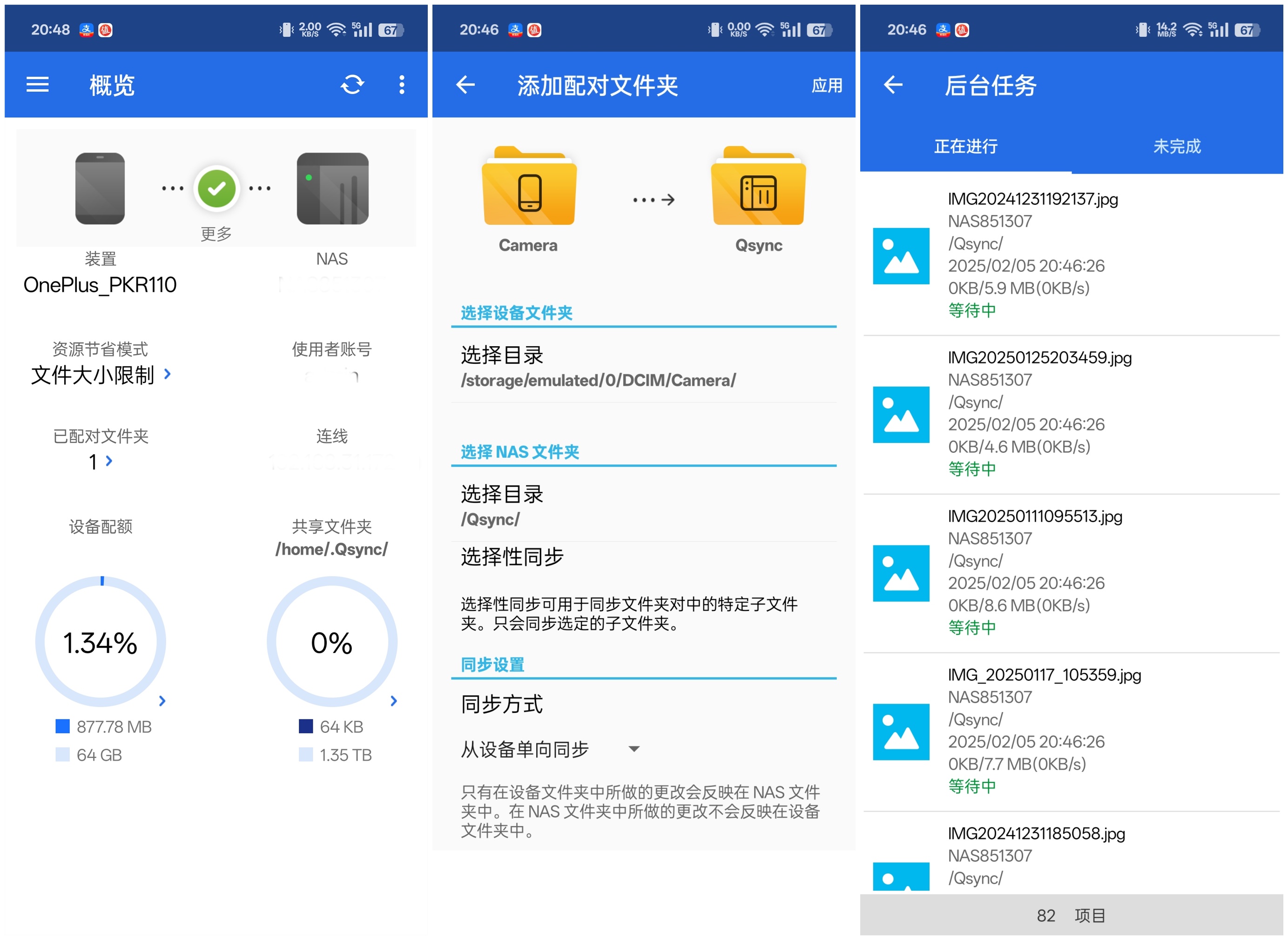 同样的在手机端安装了Qsync Pro后,就能将需要的文件同步到NAS,对于喜欢拍照的用户可以随时接将照片同步至NAS,并且可以将同步方式设置为从设备单向同步,这样只要拍完的照片就会立刻上传至NAS,再也不用担心手机内存不够用了。
