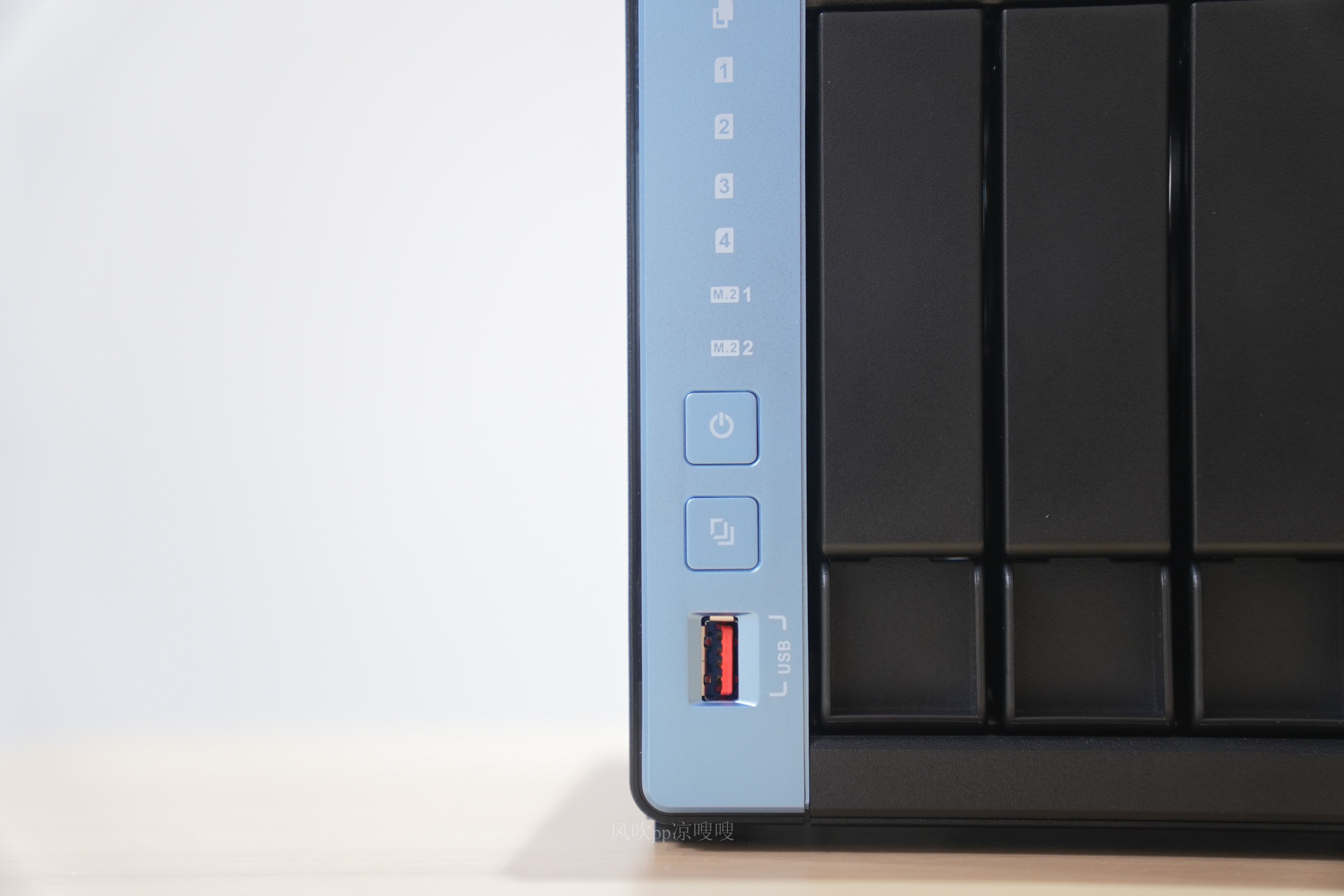 威联通TS-464C在硬件配置上展现了强大的扩展性和实用性,采用了四盘位+双M.2插槽的设计,既能满足大容量存储需求,又支持高速缓存加速,为用户提供了灵活且高效的存储解决方案。机身正面布局比较合理,操作直观便捷。在盘位的左侧,威联通巧妙地布置了一组状态LED指示灯,从上到下依次为:电源指示灯、网络状态灯、USB一键备份指示灯以及4个独立的硬盘状态灯。这些指示灯不仅提供了设备运行状态的实时反馈,还通过清晰的灯光提示让用户随时掌握设备的工作情况,极大地方便了日常管理和维护。