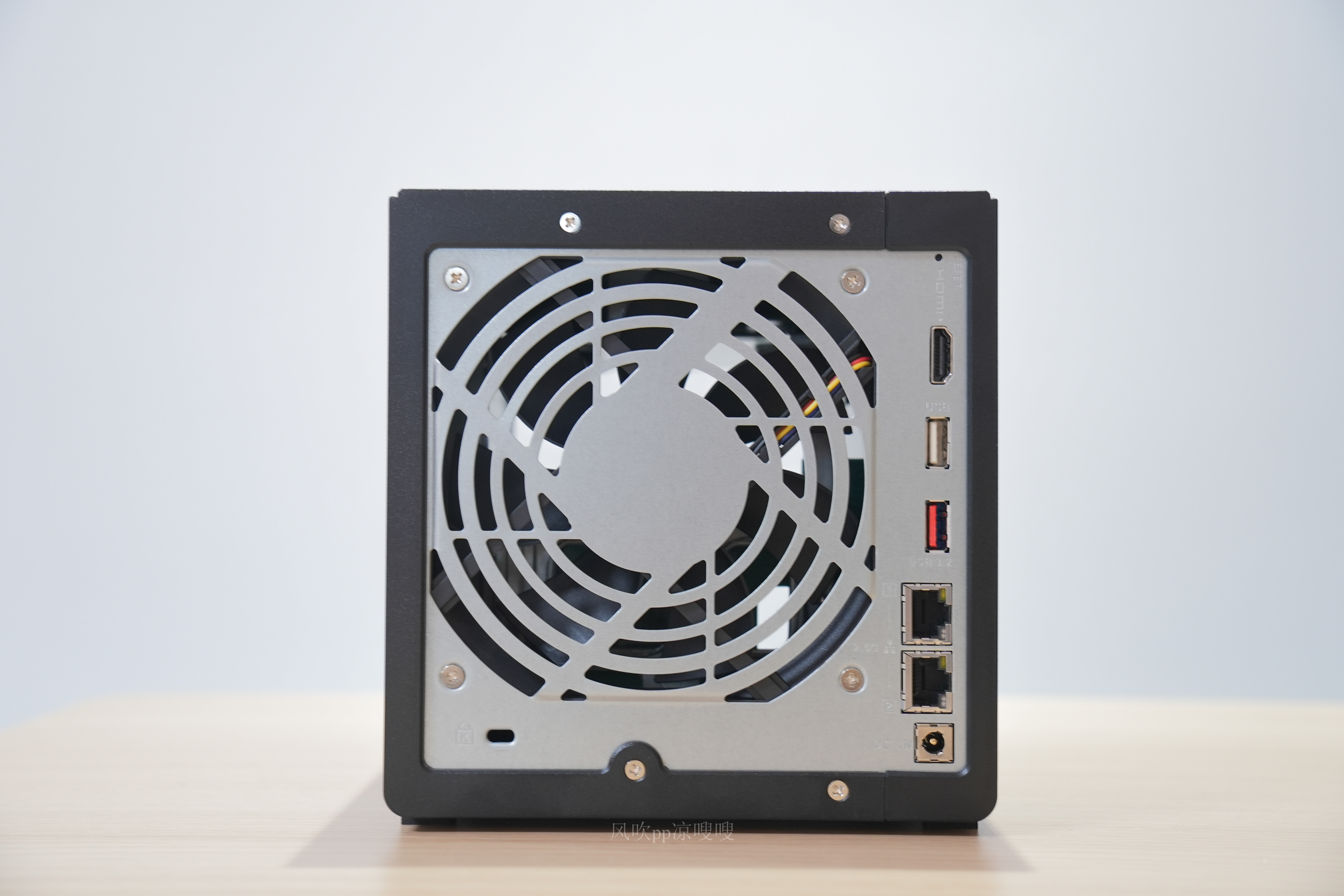 机身背部配备了一个大风扇,结合机身两侧精心设计的散热格栅,形成了高效的对流散热风道。这种设计不仅能够快速排出设备内部的热量,还能有效降低运行噪音,确保设备在长时间高负载工作下依然保持稳定性能。接口布局方面从上到下依次是Reset键、HDMI 2.0口,USB2.0口,USB 3.2 Gen2口,以及两个2.5GbE网口。