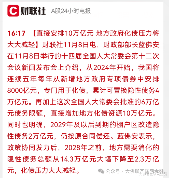 实际上除了这次化债政策外,后面估计还会有专门针对地产方面的资金,路边社传的是4万亿,然后帮着化解地产风险,估计也是分几年用,之前也有一些政策在出。