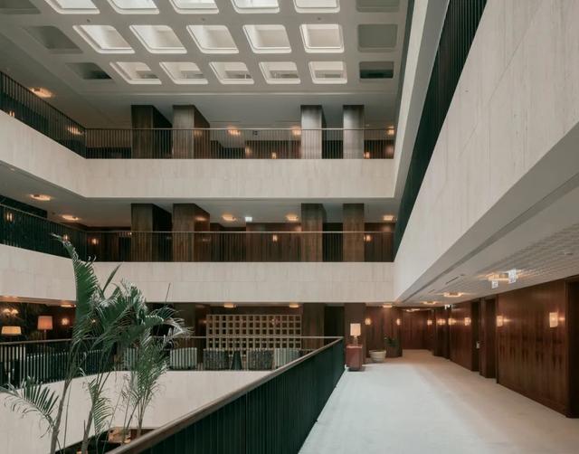 新建的裙房增强了建筑的水平美感,而屋顶的板条则引用了现有壁柱条的线性结构。其独特的阴影效果塑造了酒店的整体设计,并通过一系列精确的干预措施对内部进行了重新诠释。精心融入现有建筑的附加部分以高质量材料为特点:白色卡拉卡塔大理石和绿色蒂诺斯大理石,以及与现有立面相呼应的洞石。