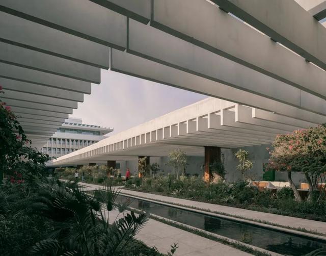 现有建筑经过翻新,改造成豪华酒店,并增加了一个额外的顶层。260 米长的基座形成了新的裙房,创造出一片绿洲,茂密的植被、艺术装置和盆景遍布其中。水岸两侧的凉亭内设有一系列服务和活动设施。这些亭子的顶棚是由细长的混凝土肋条组成的连续遮阳蓬,提供了遮阳的私人室外空间。