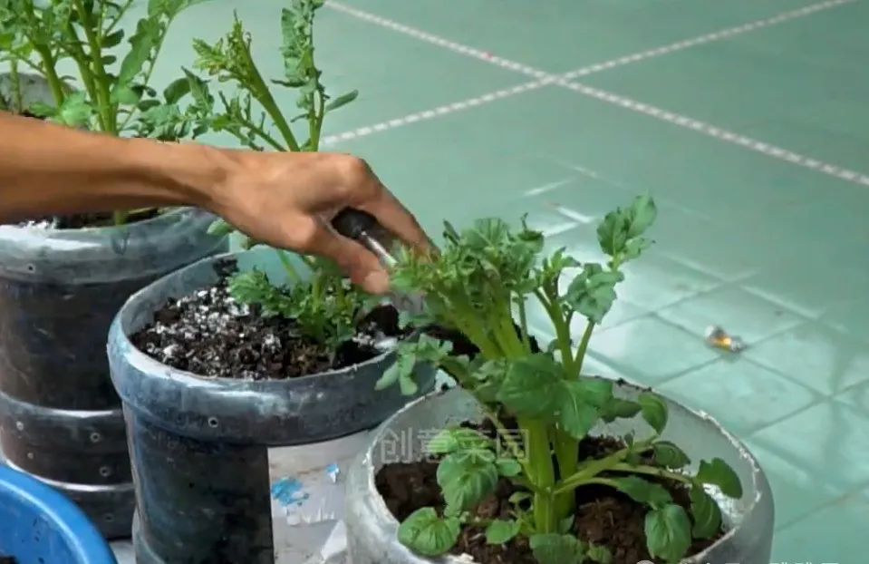 还有个重要的事儿就是,看到土豆苗长到30公分左右的时候,得给它培土。啥是培土?就是往茎秆周围堆土,露出20公分左右就成。这么做能让土豆结得更多,个头也更大。