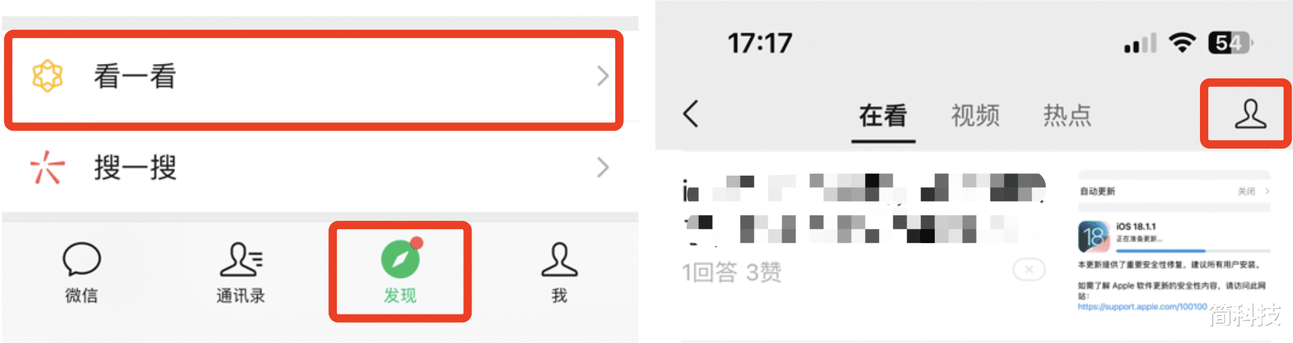 首先我们需要在微信的「发现」界面进入「看一看」,进入后点击右上角的人形图标进入个人中心。