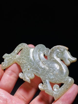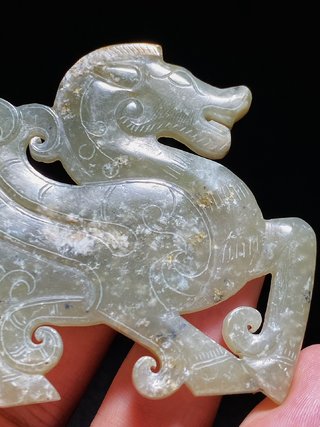 长6.7 宽0.5 高6.2厘米 重41.2克 白玉质,局部褐色沁斑,带玻璃光,古朴质雅。佩呈扁平片状,马作奔跑状,体态较为丰满,具有写实风格,昂首前视,口微张,颈项粗壮,似昂首嘶鸣,马两侧雕有双翅,四蹄伏地,体态矫健,膘肥体壮,把马的肌肉刻画得栩栩如生。汉时多有“天马”之谓,此即实物也。经过数千年的流传,至今保存完好,沁色自然,具有极高的收藏价值!