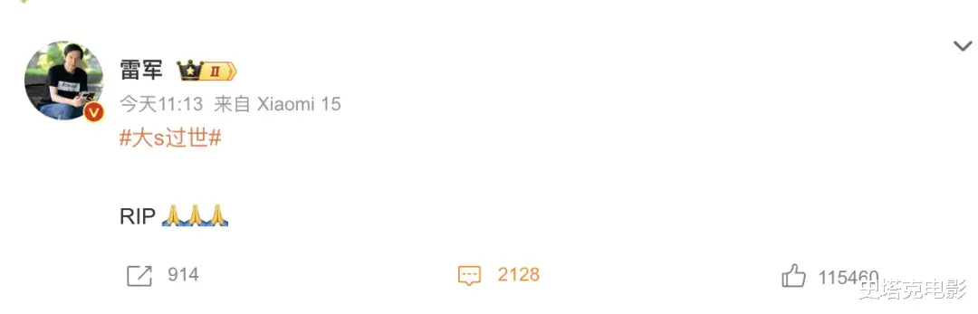 雷军在繁忙之余,还发布了一则很短的消息,来悼念大S。