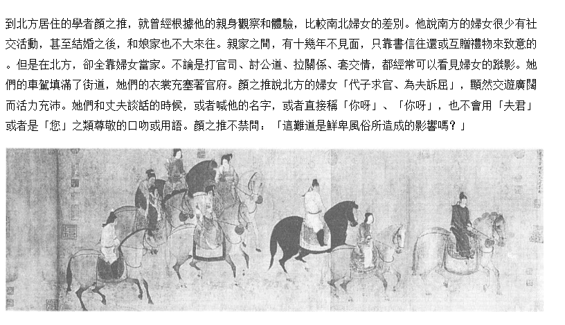 当时的南北朝,北朝由于保有“计谋从用妇人,唯门战之事乃自决之“的遗风——也就是碰到点大事还得听女的,因此整体比较开放,而南方当时的女性则因为,当时社会处于父权化或者说儒家化较高的水平,整体受到的限制都比较大。
