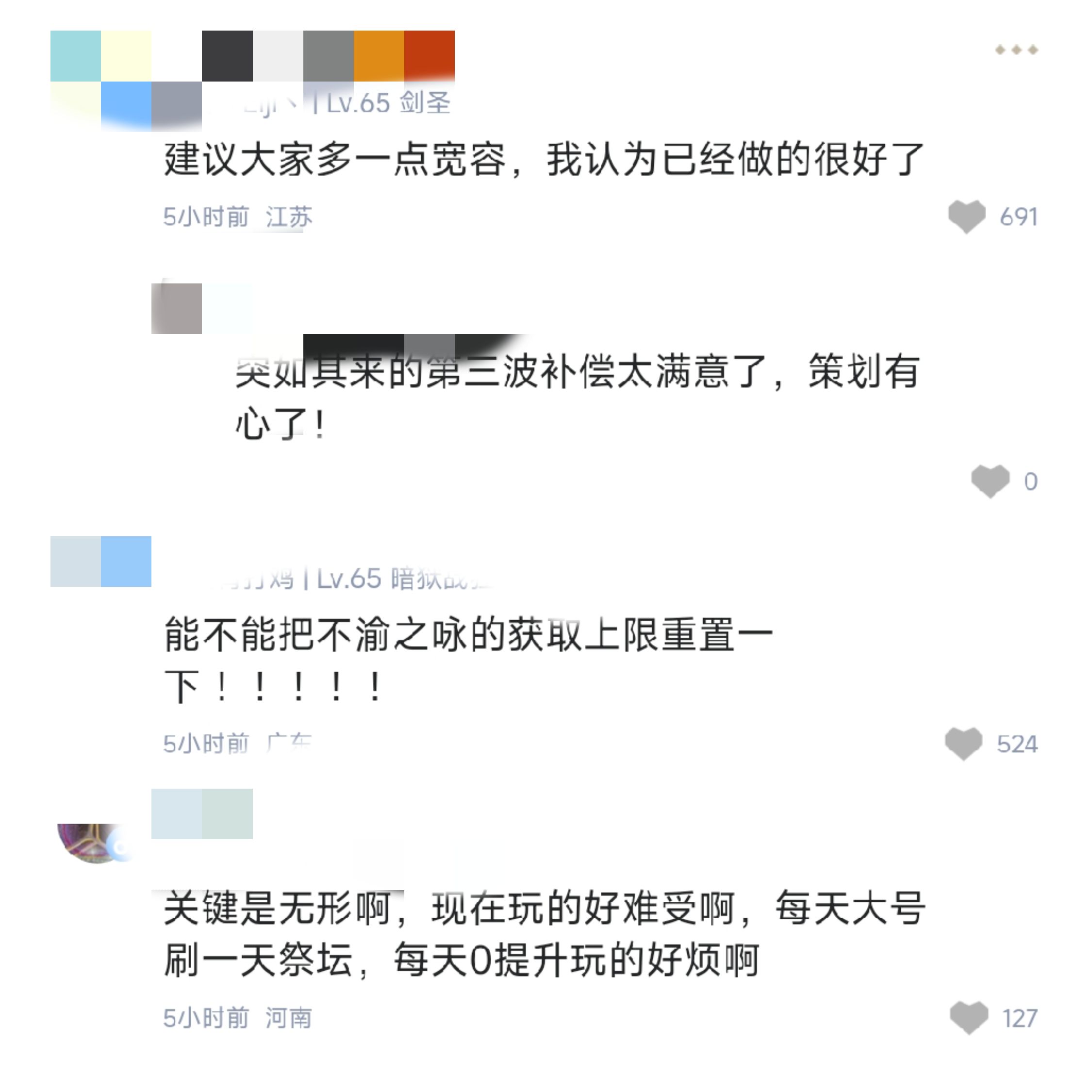 从重置说明的评论区可以看到,小伙伴们对于所谓的第三波补偿还是比较满意的同时对于原始祭坛的爆率和产出比较不满,且对于不瑜之咏的产出十分的不满,那么策划也需要继续增加勇士们无形装备的毕业速度,以及增加不喻之咏的获取上限了