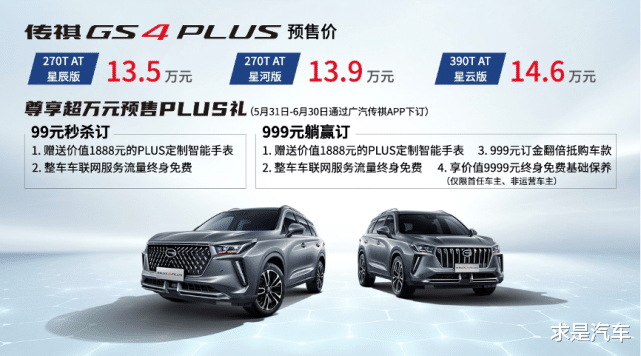 对了,上面的价格,还没有算进去官方的优惠。5月31号开启预售时,广汽传祺官方同时送出了两重PLUS大礼包,“99元秒杀订”、“999元躺赢订”两大PLUS礼都十分诱人,里面的内容都是为车主未来日常用车需求量身定制。
