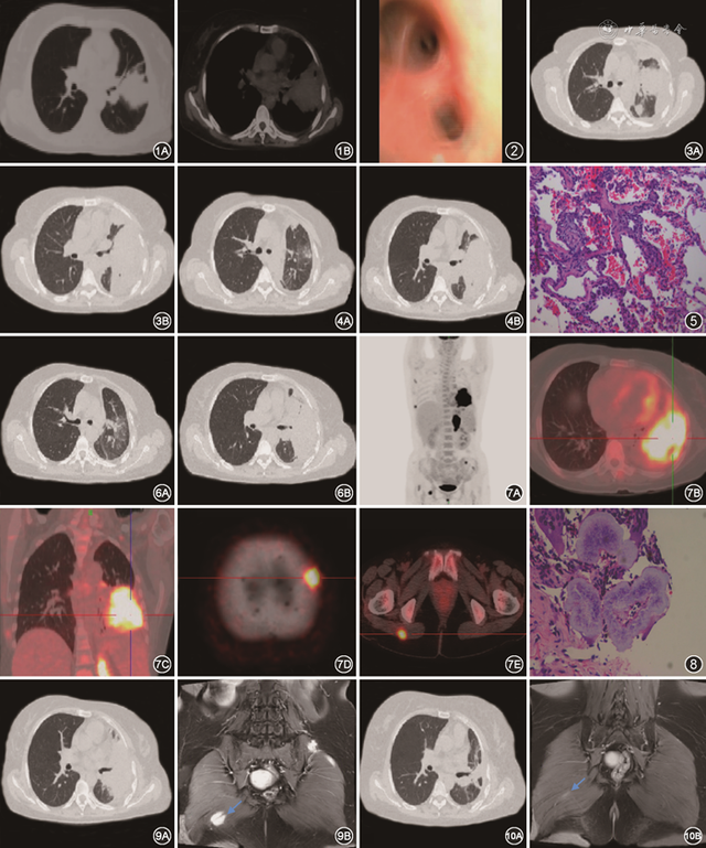 诊治经过:入院后动脉血气分析:pH值7.50,PaCO 2为38 mmHg,PaO 2为71 mmHg;血常规+生化:白细胞12.90×10 9/L,中性粒细胞10.80×10 9/L,C反应蛋白131.26 mg/L;丙氨酸转氨酶54.4 U/L,天冬氨酸转氨酶39.8 U/L,白蛋白25.3 g/L;肿瘤全套:CA125为59.20 U/ml,CA72-4为27.00 U/ml,FE为698.9 μg/L,余未见明显异常;细胞+多因子:淋巴细胞亚群绝对值及占比均正常,IL-6为111.56 ng/L,C3、C4及补体正常;结核等相关检查未见明显异常。因此,给予盐酸莫西沙星联合头孢哌酮钠舒巴坦钠经验性抗感染及对症支持治疗。支气管镜检查+肺泡灌洗( 图2 ):双侧支气管可见黏性分泌物,左肺舌叶及下叶黏膜充血。灌洗液床旁快速病原菌鉴定(简称M-ROSE)提示:细菌,偶见杆菌,巨噬细胞1.65%,中性粒细胞97.80%。微生物宏基因组二代测序(metagenomics next generation sequencing,mNGS)结果回报:gipuzkoensis诺卡菌属(序列数303,置信度99%)。胸部增强CT( 图3 )提示:左肺上叶占位,考虑恶性伴阻塞性炎症可能;纵隔多发肿大淋巴结,转移不除外;左侧胸腔积液(包裹性)、相邻肺组织膨胀不全;少许心包积液。于2022年2月22日调整抗感染方案为磺胺甲噁唑/甲氧苄啶片(4片,3次/d)+亚胺培南/西司他丁钠(1 g,1次/8 h),2022年3月1日进一步行超声引导下胸腔闭式引流术。胸腔引流出脓血性液体约50 ml。化验回报:橘红色浑浊液体,比重1.034,蛋白定性试验阳性,细胞总数满视野,其中白细胞2 688×10 6/L,单核细胞38%,多核细胞62%;胸腔积液中蛋白50.5 g/L,氯96.94 mmol/L,糖1.59 mmol/L。多次送检血培养未见明显异常。于2022年3月10日复查胸部CT( 图4 ):病灶局部较前稍缩小。2022年3月11日行CT引导下经皮肺穿刺活检术。病理提示(图5):(左上肺)穿刺肺组织慢性炎伴急性炎,肺泡上皮增生,肺泡内见出血,局灶纤维组织增生,见少量肉芽肿病变。患者2022年3月23日出院,继续口服磺胺甲噁唑/甲氧苄啶片(2片,3次/d)。