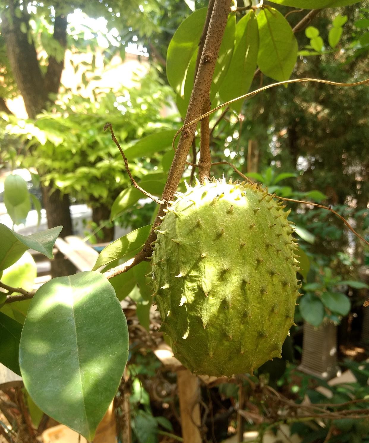 成熟的释迦果,果实呈椭圆形或心形,表面布满了独特的突起果瘤,外观奇特而引人注目。